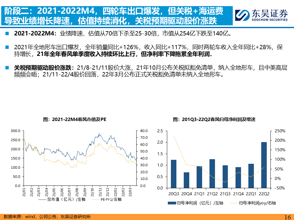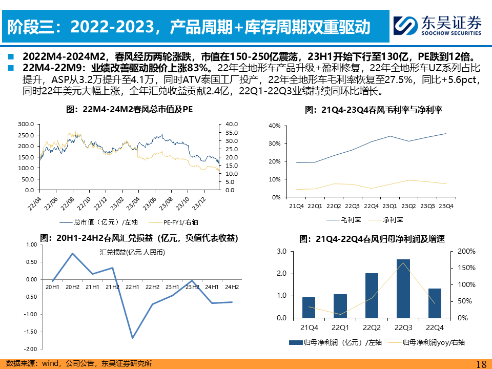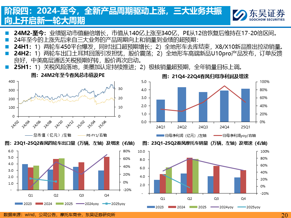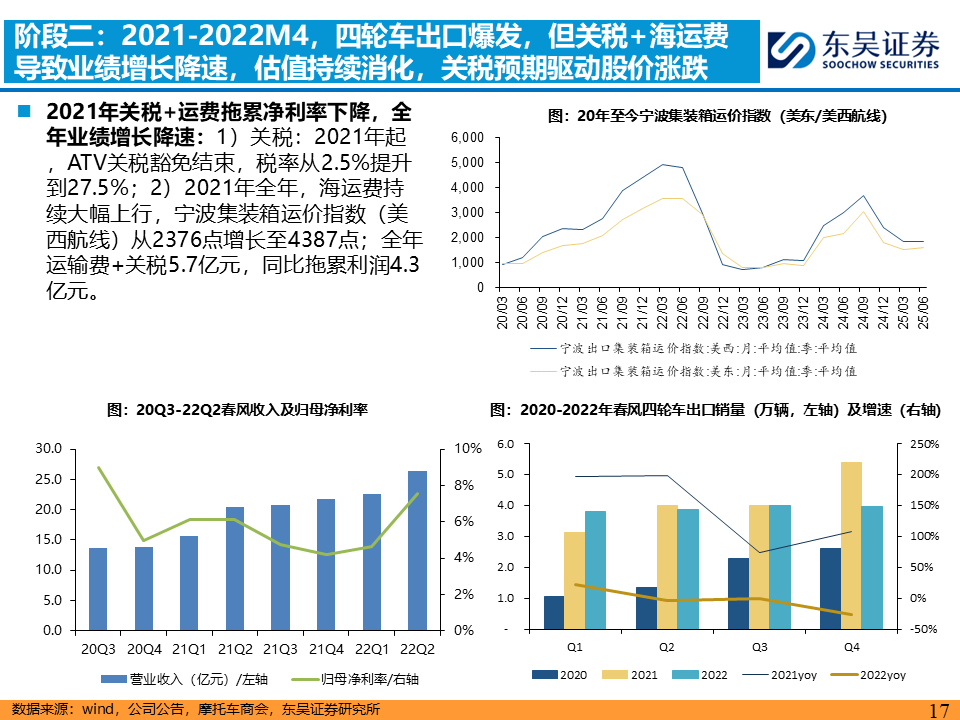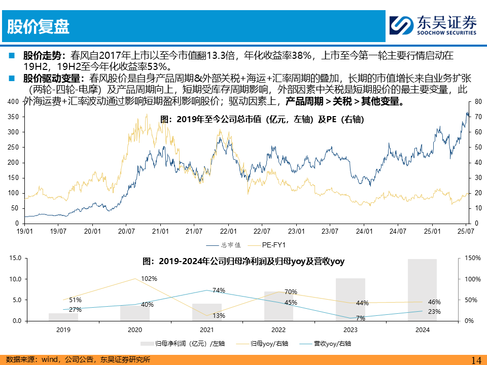 股价驱动因素来看:春风股价是自身产品周期外部关税+海运+汇率周期的叠加,长期的市值增长来自业务扩张(两轮-四轮-电摩)及产品周期向上,短期受库存周期影响,外部因素中关税是短期股价的最主要变量,此外海运费+汇率波动通过影响短期盈利影响股价。
