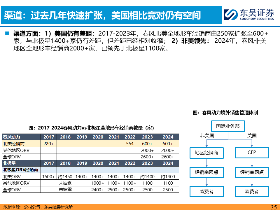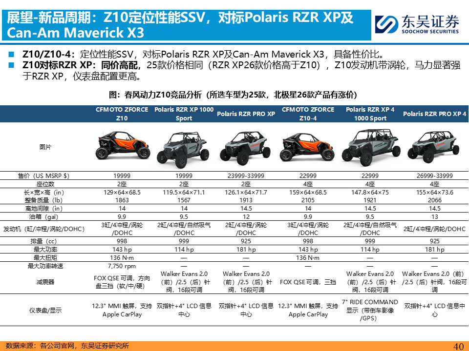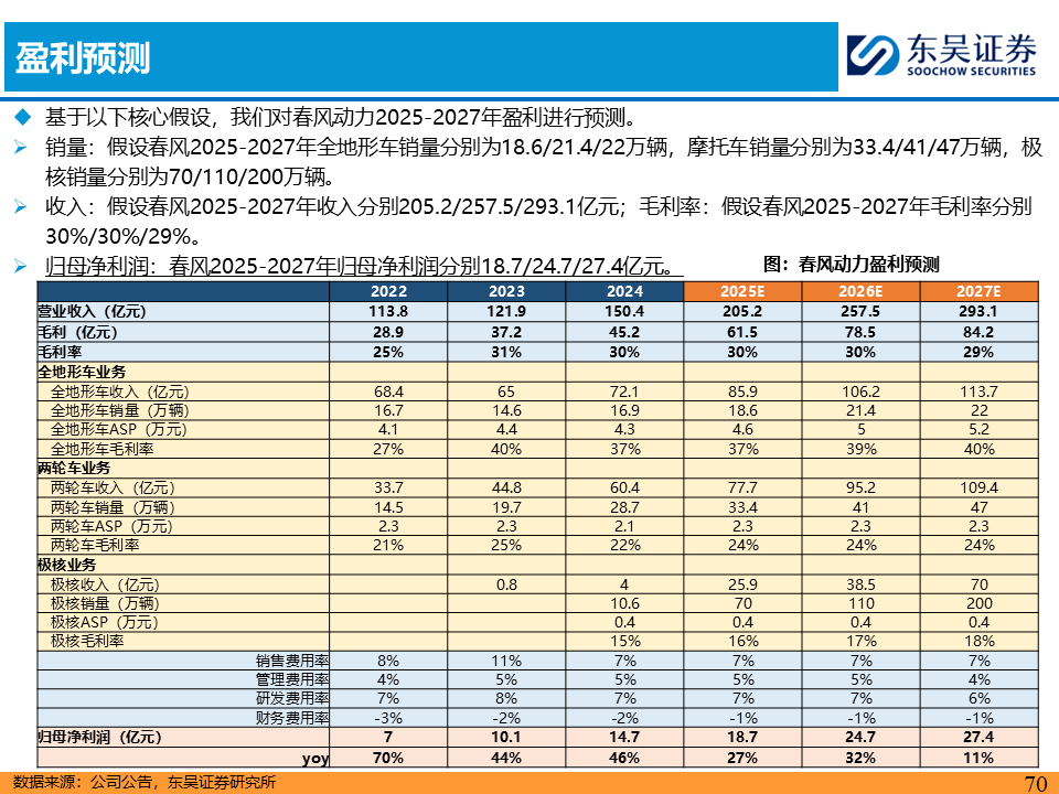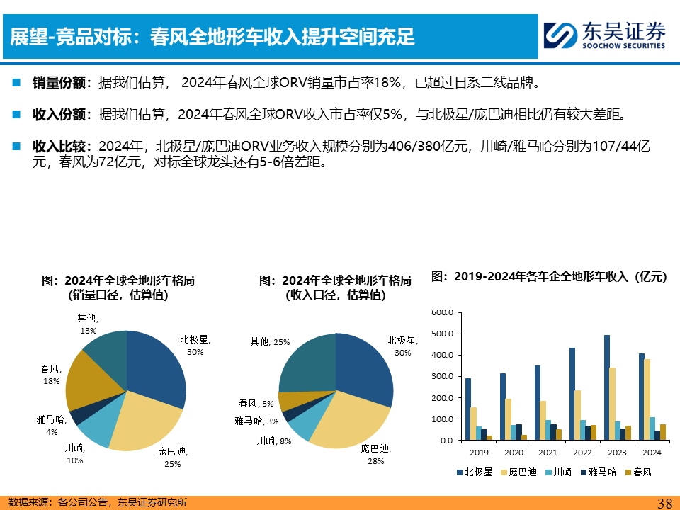 展望未来,春风将于25年发布新平台新品Z10,后续或有其他新品继续推出,且ATV平台即将换代,高端全地形车市场空间广阔,对标北极星/庞巴迪,其销量为春风的1.5-2倍,收入为春风的5-6倍,我们预计,2030年之前春风全地形车收入可实现翻倍增长,利润增幅更高。