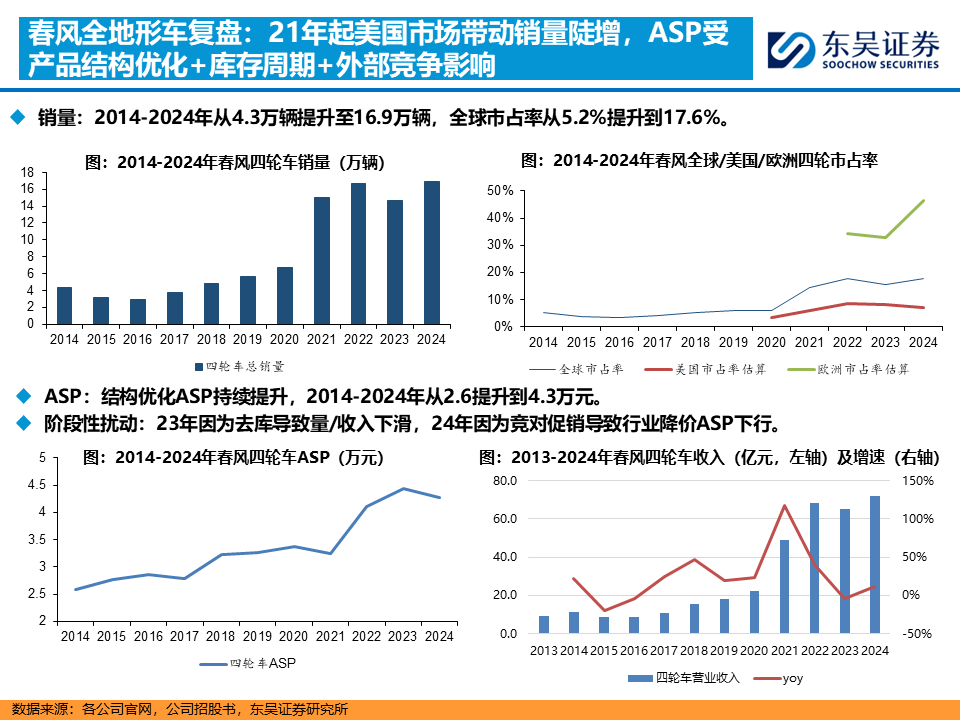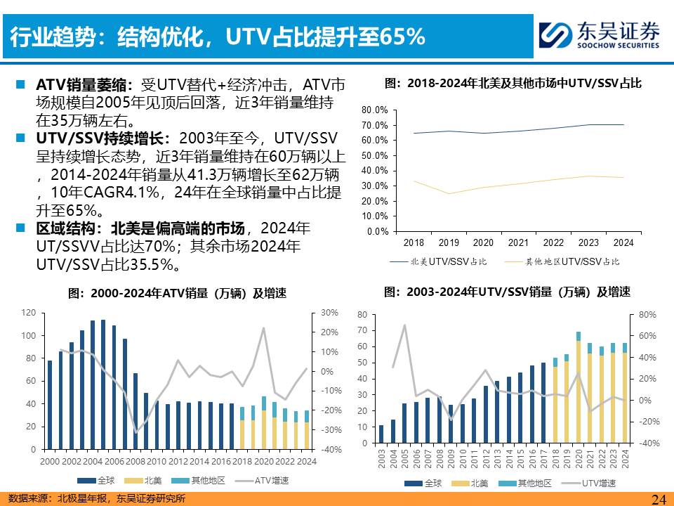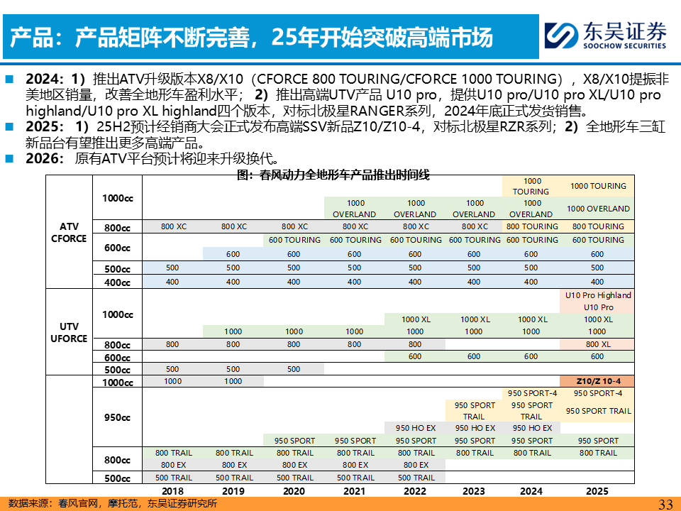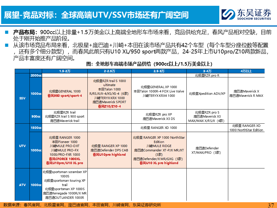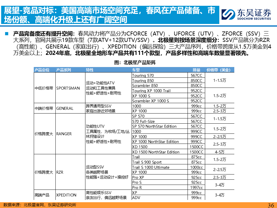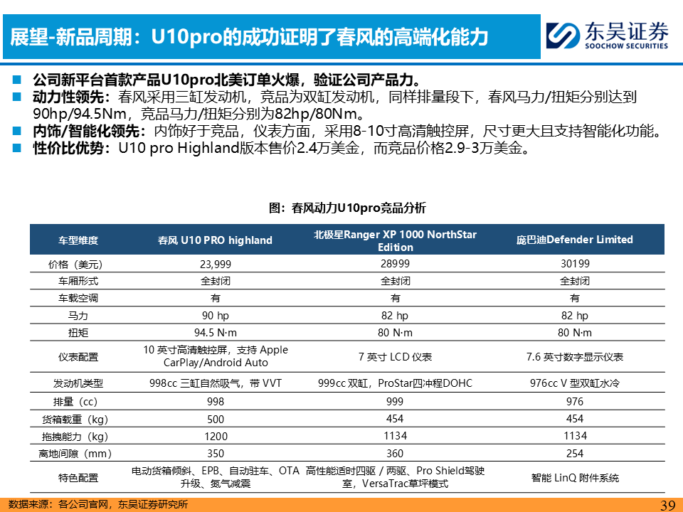 2024年,春风美国全地形车去库结束,同时开启高端化新叙事:24年上市X8/X10新品,8月发布高端化新平台产品U10pro,ASP与单车利润翻倍式增长,突破1000cc及以上UTV/SSV高端市场,U10pro的畅销验证了春风产品力的实质性提升,同时真正打开了春风全地形车业务可触达市场空间。