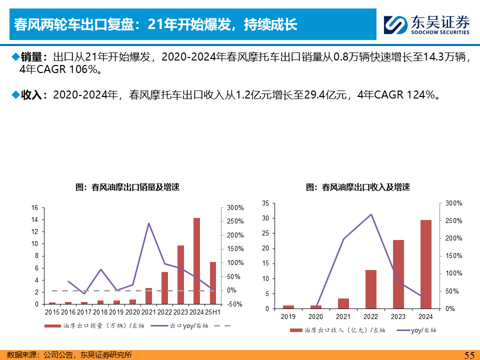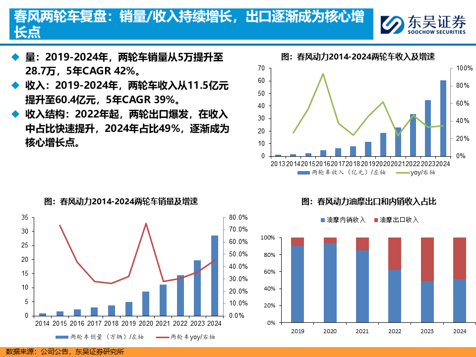 2019-2024年,春风两轮车收入从11.5亿元增长至60.4亿元,5年CAGR 39%,且增长点逐渐从内销变为出口+高端化。