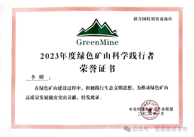 近日,在首届中国绿色矿山国际年会上,金徽股份绿色矿山发展获得广泛认可,金徽股份实控人李明荣获“全国绿色矿山科学践行者”光荣称号,这也是李明在取得全国绿色矿山杰出贡献奖、全国绿色矿山第一矿创建者、绿色矿山高质量发展引领者后再获殊荣。