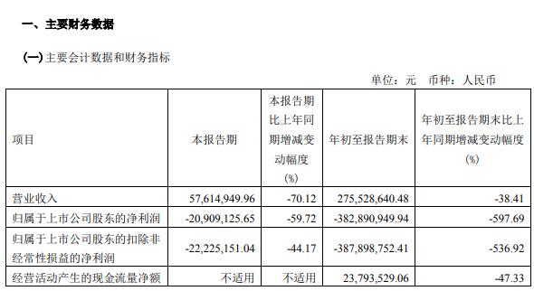 挖贝网 10月13日消息,碳元科技(603133 )发布三季度业绩报告,当季营收5761万元同比下降70.12%,亏损2091万元。前三季度,营收为2.75亿元、亏损3.83亿元。