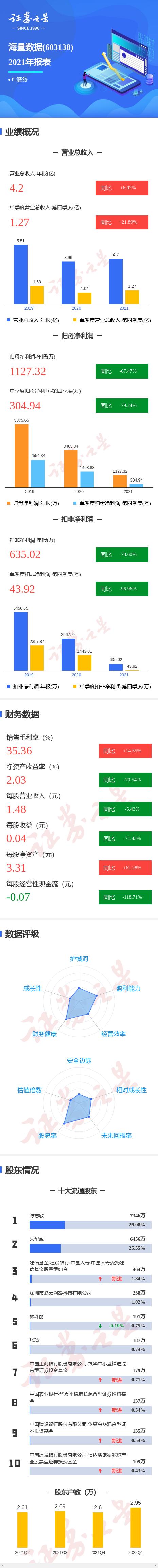 海量数据2022一季报显示,公司主营收入7885.58万元,同比下降22.84%;归母净利润-1075.38万元,同比下降312.18%;扣非净利润-1132.48万元,同比下降366.42%;其中2022年第一季度,公司单季度主营收入7885.58万元,同比下降22.84%;单季度归母净利润-1075.38万元,同比下降312.18%;单季度扣非净利润-1132.48万元,同比下降366.42%;负债率16.46%,财务费用-379.38万元,毛利率37.3%。