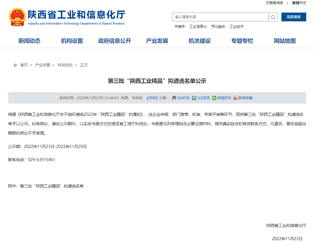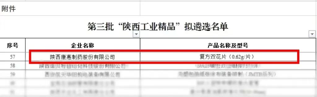为贯彻落实党的十九大精神以及习近平总书记来陕考察重要讲话精神,深入实施创新驱动战略,加快新产品研发和产业化,全面提升我市工业产品质量水平,增强市场竞争力,促进制造业高质量发展,根据陕西省工业和信息化厅《关于组织遴选2022年“陕西工业精品”的通知》(陕信发(2022] 267号)精神,我公司组织申报的独家专利产品复方双花片,经部门推荐、专家评审和公示等环节,入选第三批“陕西工业精品”榜单。