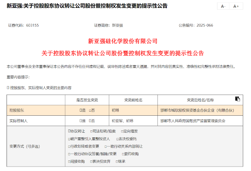 有机硅行业细分龙头 新亚强 突然易主,犹如一面多棱镜,折射出中国制造业发展的一个缩影。11月25日, 新亚强 发布公告称, 邯郸市人民政府 国资委旗下城欣股权投资基金斥资19.6亿元,成为该公司控股股东。公告显示,该公司控股股东、实际控制人之一初琳,于11月24日与 邯郸市城欣股权投资基金合伙企业 (有限合伙)(以下简称城欣基金)签署了股份转让协议,将其持有的9442万股无限售条件流通股转让给城欣基金。