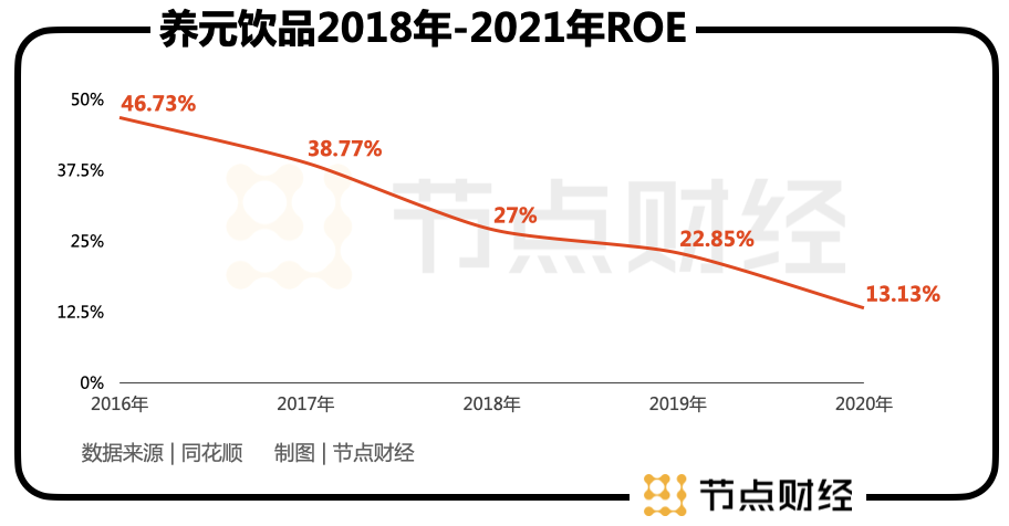 总体比较来看,养元饮品目前的估值相对处于行业中下水平。而从ROE(净资产收益率)表现来看,2016年至2020年,其数值从46.73%逐年下滑至13.13%。相比之下,承德露露同期虽然从未达到过30%以上,但一直保持在20%以上,表现更为稳健。