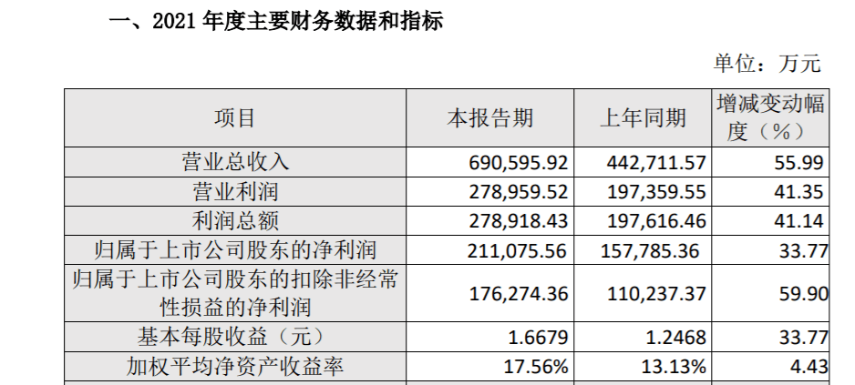 3月10日,养元饮品公布的最新业绩公告显示,2021年,养元六个核桃营业总收入69.06亿元,同比增长55.99%;利润总额27.89亿元,同比增长41.14%;净利润21.1亿元,同比增长33.77%;扣非净利润17.63亿元,同比增长59.9%。