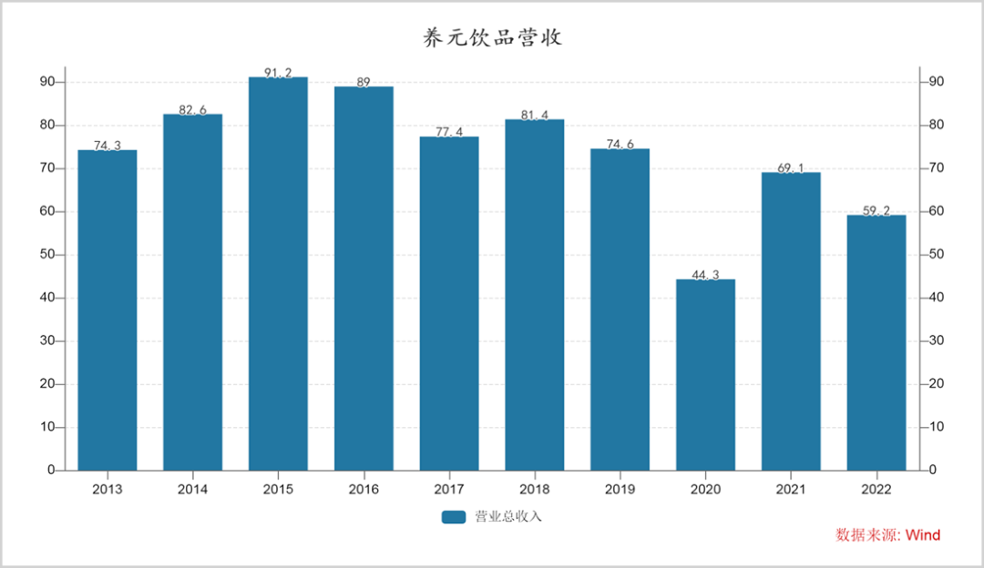 2015年以后,养元饮品的规模整体一直处于收缩状态,到2022年,公司营收降至59亿,较巅峰时已下滑近四成。