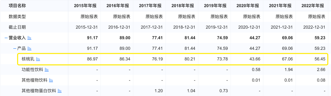 凭借一则广告语强势洗脑的六个核桃,曾创造植物蛋白乳品的现象级销量,也让手持这一爆款单品的母公司养元饮品2015年营业收入一度接近百亿。