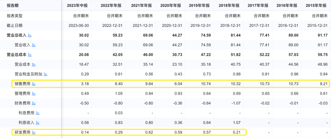 财报显示,公司2015年销售费用约9.21亿元。随后的2016-2019年间,公司将销售费用加大至10亿元以上,营收虽有所下滑,但依然维持在70亿元以上。2020年-2022年期间,销售费用分别为6.04亿元、9.64亿元、8.4亿元。