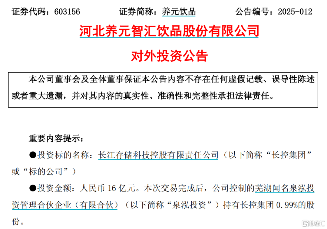 25日晚,以“六个核桃”闻名的养元饮品突然披露,其早在2023年12月便通过子公司向长江存储母公司长控集团注资16亿元,获得0.99%的股权;同时也公布了2024年年报、2025年一季报。