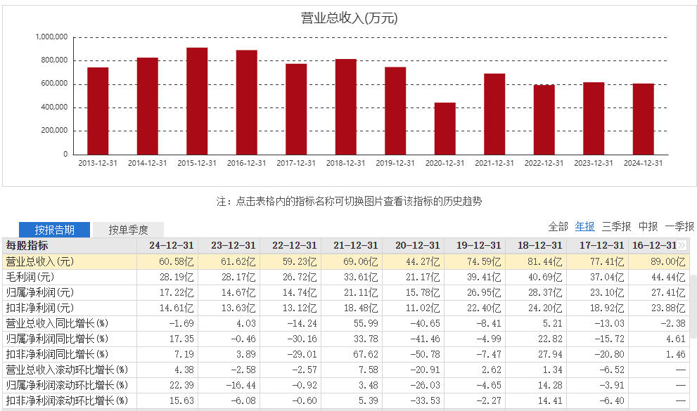 从近年来数据看,养元饮品业绩下滑明显。东财数据显示,2018年至2024年,养元饮品营收分别为81.44亿元、74.59亿元、44.27亿元、69.06亿元、59.23亿元、61.62亿元、60.58亿元,增速分别为5.21%、-8.41%、-40.65%、55.99%、-14.24%、4.03%、-1.69%,营收6年间减少了20.86亿元。