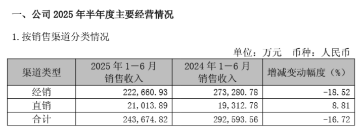 证券之星了解到,养元饮品现阶段仍以传统渠道为主,截至今年上半年末,公司经销商数量达到2727家,报告期内净增长28家,然而来自经销渠道的收入却较上年同期下降18.52%至22.27亿元。相比之下,直销渠道同比增长8.81%至2.1亿元,但这一增长规模有限,未能形成对传统经销渠道下滑的有效对冲,导致上半年公司经营继续承压。