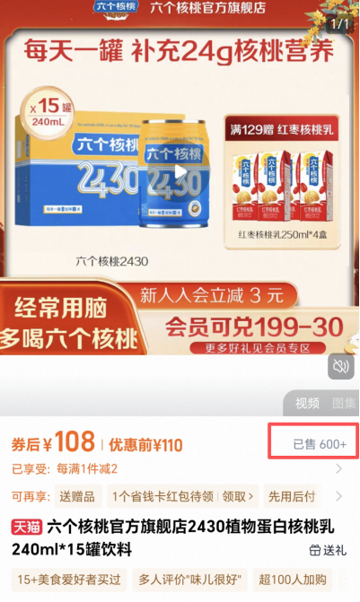 显然,养元饮品期望借助高端产品打破核桃乳的增长困局。不过天猫平台数据显示,上述同规格数量下,2430系列仅销售超600+,远低于销量超2万+的六个核桃精品型核桃乳,价格敏感度背后,是消费者对其“高端属性”较低的接受度。