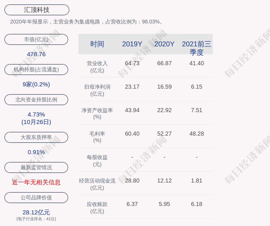 2020年年报显示,汇顶科技的主营业务为集成电路,占营收比例为:98.03%。