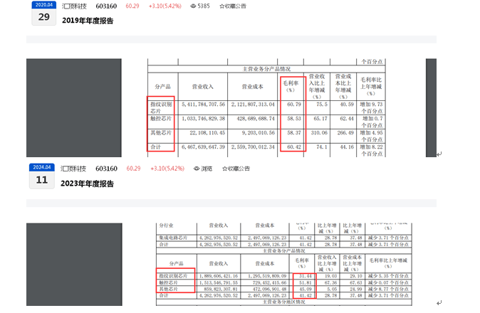 但市场竞争加剧背景下,汇顶科技的毛利率却波动明显。从最近五个年度来看,汇顶科技的指纹识别芯片于2019年度录得毛利率60.79%,而2023年度该产品毛利率仅录得31.44%;2019年度,汇顶科技的触控芯片毛利率录得58.53%,而2023年度该产品毛利率仅录得51.81%。从主营业务毛利率来看,汇顶科技2019年度录得60.42%,而2023年度仅录得41.42%。