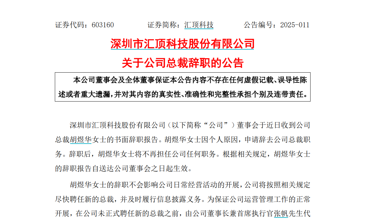 公告称,胡煜华的辞职不会影响公司日常经营活动的开展,公司将按照相关规定尽快聘任新的总裁,并及时履行信息披露义务。在公司未正式聘任新的总裁之前,由公司董事长兼首席执行官张帆代行总裁职责。