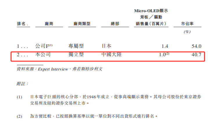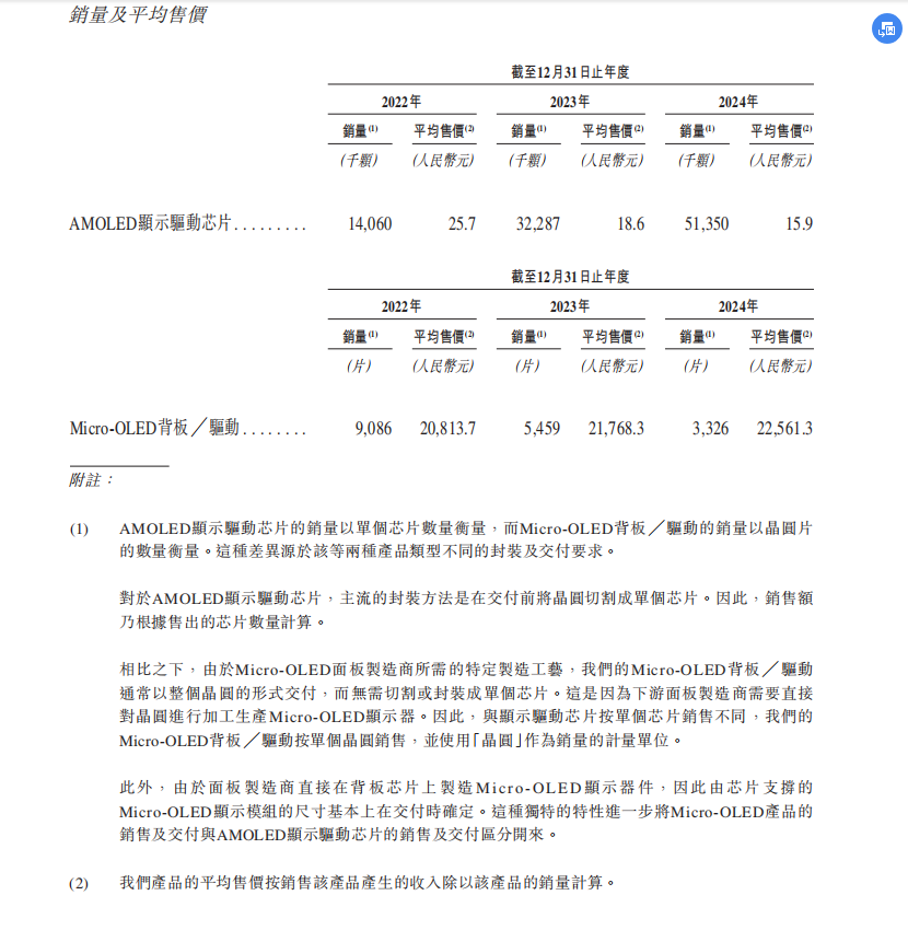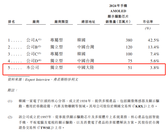 1)根据弗洛斯特沙利文的报告,截至2024年底,云英谷是中国大陆首家通过品牌公司认证及唯一一家品牌公司累计销量超过千万颗OLED显示驱动芯片的企业,同时其2024年的销量已超过5000万颗,2022年至2024年的销量分别为1410万颗、3230万颗、5140万颗,在全球所有智能手机品牌的OLED显示驱动芯片供货份额由2022年的1.2%上升至2024年的43.8%,以2024年的销量计,云英谷是中国大陆第一和全球第五的显示驱动芯片供应商。
