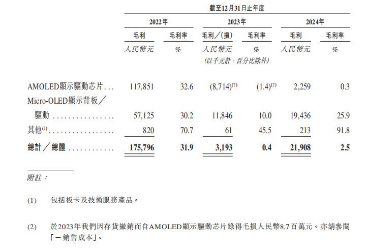总体毛利率由2022年的31.9%下滑至2023年的0.4%,再小幅回升至2024年的2.5%。其中,OLED显示驱动芯片毛利率分别为32.6%、-1.4%、0.3%;Micro-OLED显示背板/驱动分别为30.2%、10.0%、25.9%;其他(板卡及技术服务产品)分别为70.7%、45.5%、91.8%。