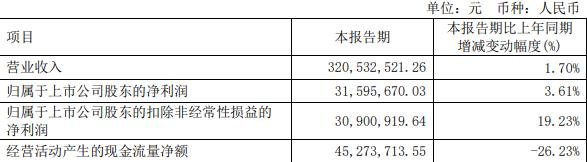 据福达股份2024年第一季度报告,报告期内,公司实现营业收入3.21亿元,同比增长1.70%;归属于上市公司股东的净利润3159.57万元,同比增长3.61%;归属于上市公司股东的扣除非经常性损益的净利润3090.09万元,同比增长19.23%;经营活动产生的现金流量净额4527.37万元,同比减少26.23%。