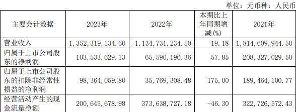 据福达股份2023年年报,报告期内,公司实现营业收入13.52亿元,同比增长19.18%;归属于上市公司股东的净利润1.04亿元,同比增长57.85%;归属于上市公司股东的扣除非经常性损益的净利润9836.41万元,同比增长175.00%;经营活动产生的现金流量净额2.01亿元,同比减少46.30%。