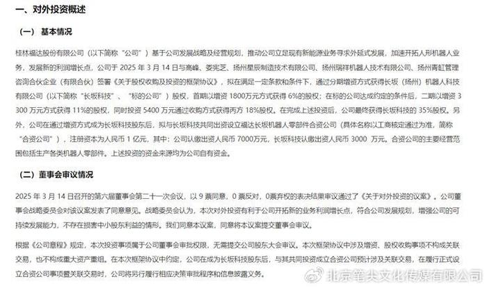 《笔尖网》关注到,3月17日,福达股份发布公告披露,公司拟出资1.05亿元,获得长坂(扬州)机器人科技有限公司(以下称“长坂科技”)35%股权,同时认缴出资7000万,与长坂科技共同出资设立福达长坂机器人零部件合资公司,合计投资1.75亿,正式涉足机器人零部件领域。