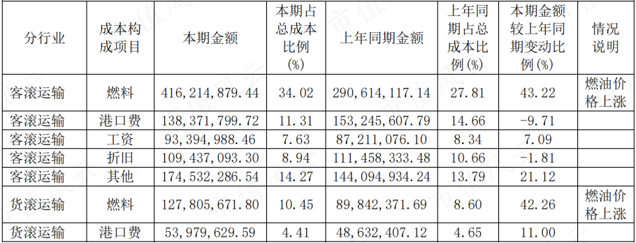 从成本端来看,客货滚运输的燃料、港口费、折旧、人工为公司主要营业成本,其中船用燃料油是客滚运输最大成本。