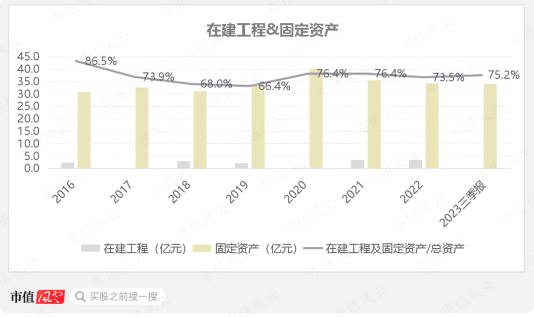 公司资产偏重,固定资产为最大资产科目。截至2023年三季度末,固定资产为34亿元,占总资产比重达75%。