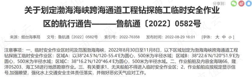 2023年7月,中国海事局官网发布《关于划定渤海海峡跨海通道工程勘察作业临时安全作业区的航行通告》,上一次官方发布相关通告是在2022年8月。