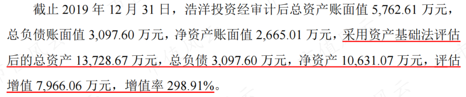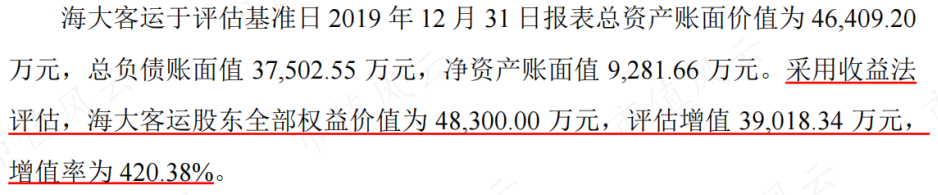 浩洋投资资产基础法评估下净资产为1亿元,增值率约300%;海大客运收益法评估下净资产为4.8亿元,增值率为420%。溢价收购形成商誉2.6亿元。