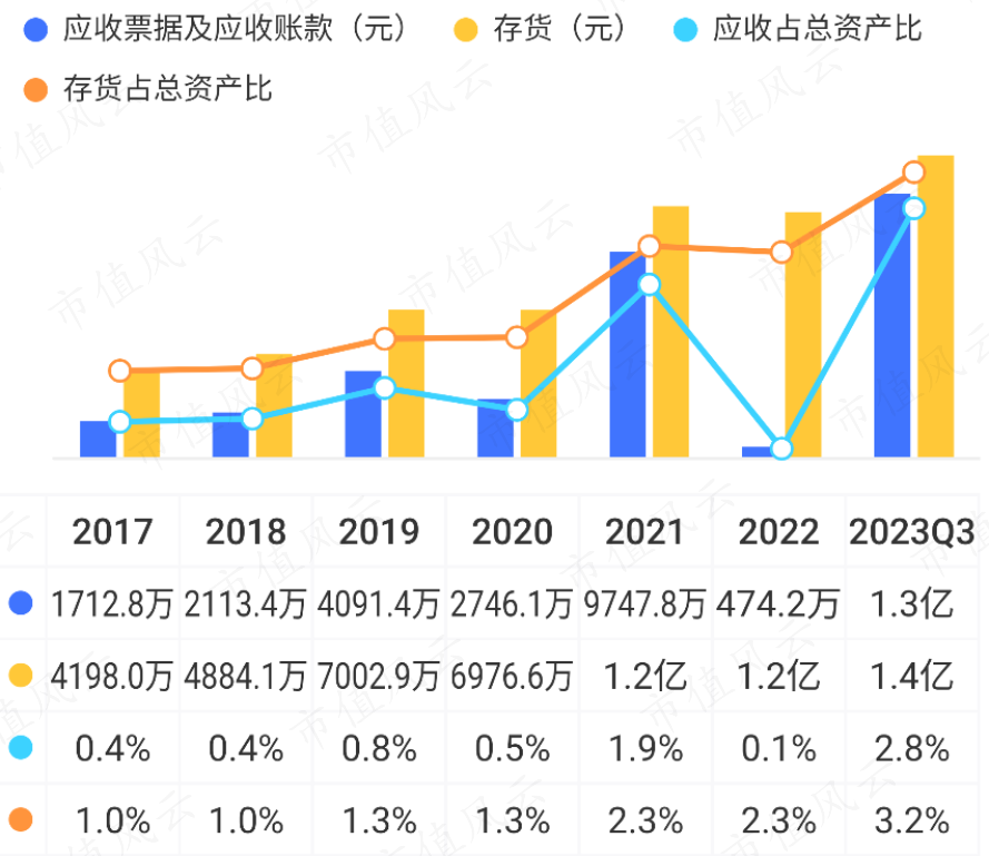 2021年,公司应收账款及应收票据账面价值出现大幅增长,主要为应收运费款增加所致。截至2023年三季度末,应收账款及应收票据金额为1.3亿元,占营收比重为9%。