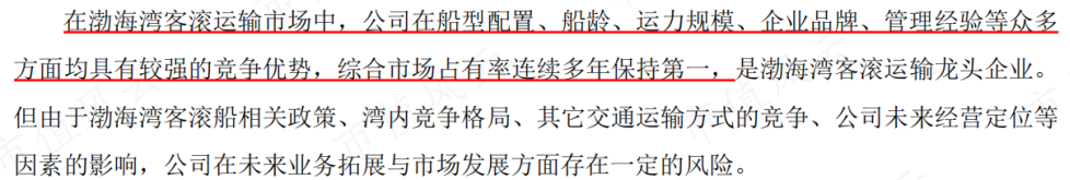 公司在招股书中表示,渤海湾跨海通道长期有修建的可能性,若建成会对客滚运输市场造成不利影响,但该项目前期可行性论证时间较长、投资巨大、建设周期长,多年来,进展均不明朗。