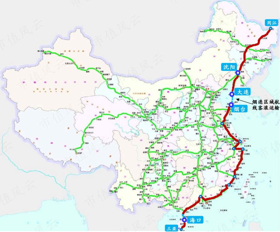 海路运输主要通过烟连区域航线,该航线是沈海高速公路的海上连接段。