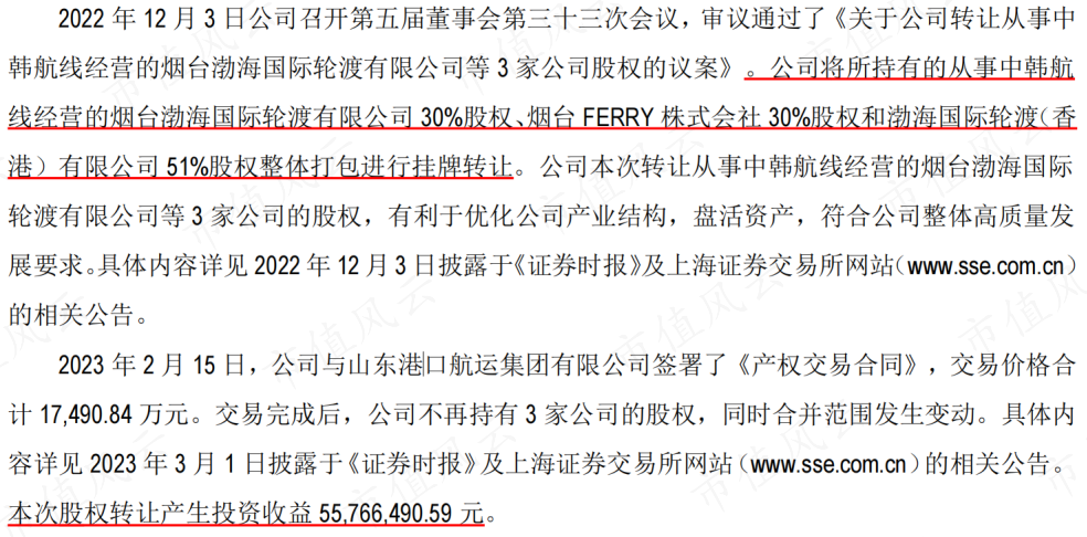 2023年,公司完成了对从事中韩航线经营的烟台渤海国际轮渡有限公司等3家公司的股权转让,由此产生投资收益5577万元,对前三季度净利润影响较大。