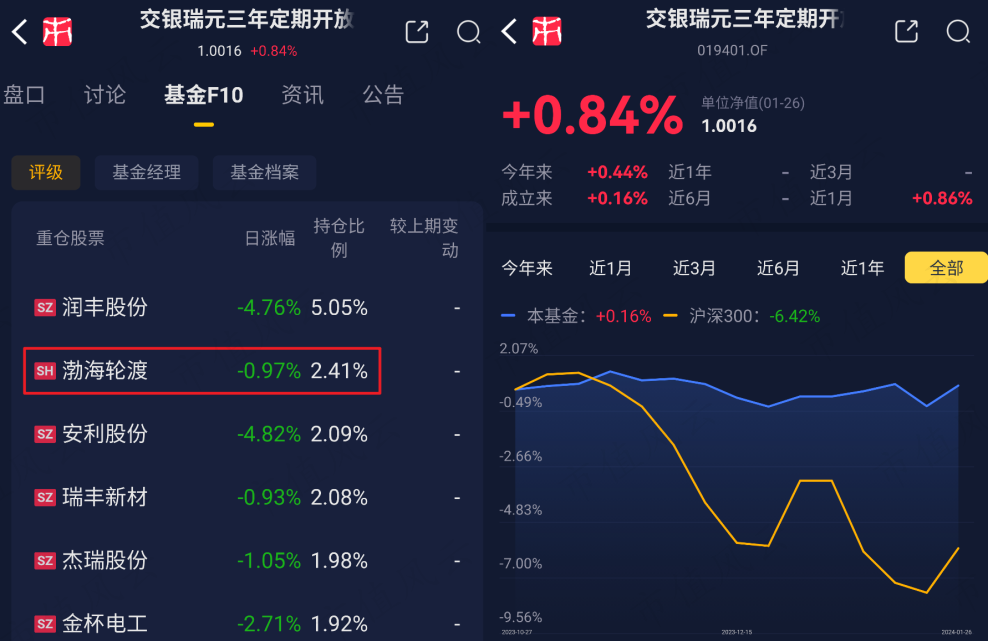 其中,持仓股数最高的基金为交银瑞元三年定期开放混合(019401.OF)。截至2023年末,渤海轮渡为其第二大重仓股。