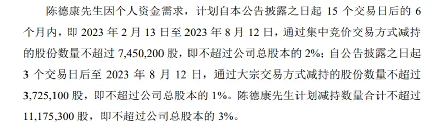 此后陈德康也有零星减持动作,到今年一月中旬,其再次减持。据莎普爱思公告称,陈德康计划自2023年2月13日~8月12日,通过集中竞价和大宗交易方式合计减持不超过11,175,300股,约占公司总股本的3%。如果上述减持足量完成,那么陈德康的持股比例将下降到10%左右。