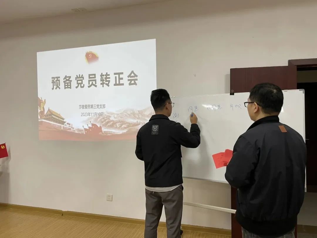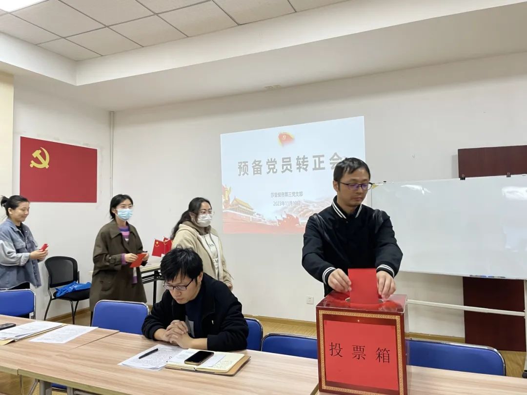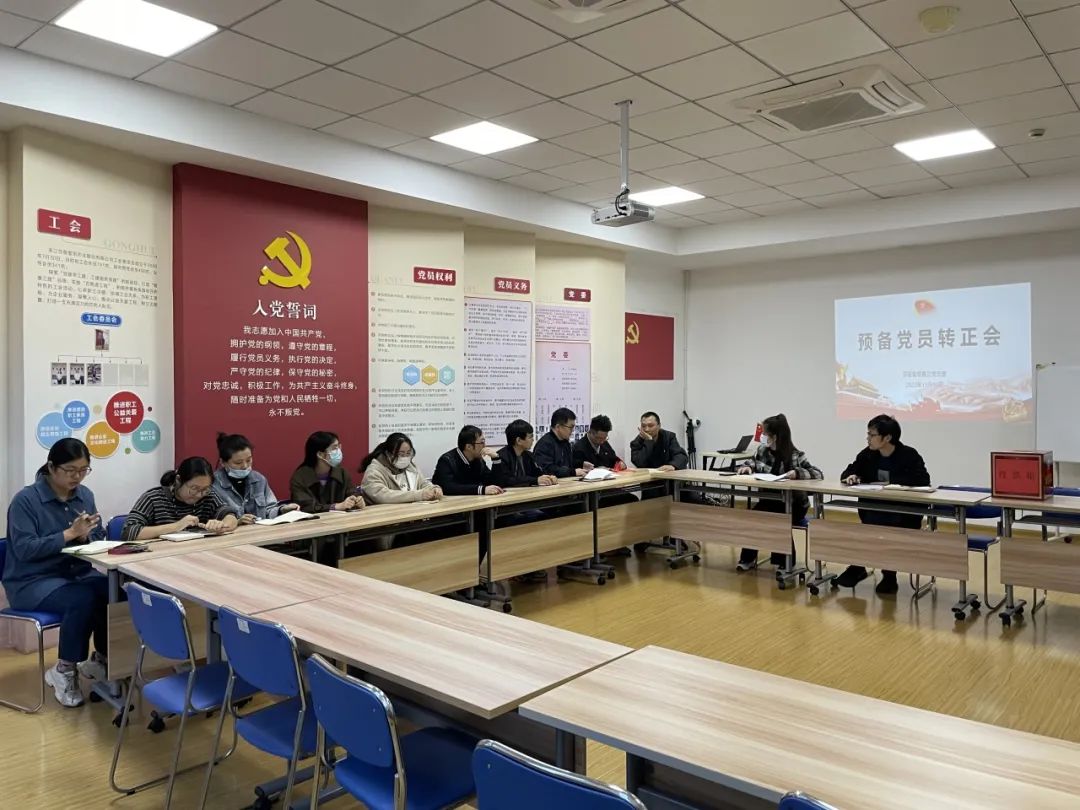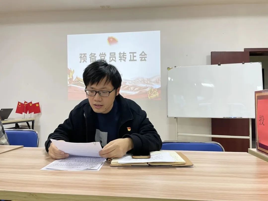 在预备党员转正会上,第二支部书记金晓燕、第三党支部书记王怡玲分别主持会议,介绍大会流程以及各项事宜。针对陶叶新、谢焘同志的转正申请,与会党员纷纷发表意见、充分讨论并进行不记名投票表决。最终,大会全票赞同陶叶新、谢焘同志按期转正,成为一名正式的中国共产党员。