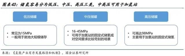 储氢容器根据压力级别不同,分为低压、中压、高压三类,低压储罐用于就地大规模存储,中压储罐可用于加氢站的固定式储氢或其他对空间要求比较苛刻的场景,高压储罐主要用于加氢站的固定式储氢。