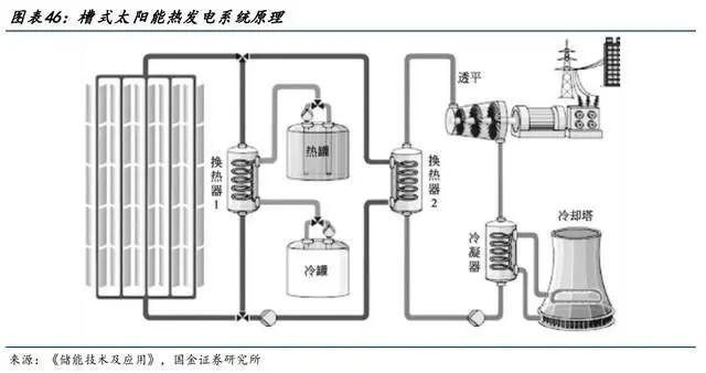 太阳能热发电主要指将太阳能转化为热能,再通过热功转换过程实现发电,根据集热方式不同分为槽式、塔式、碟式或线性菲涅尔四种。其中的传热流体可使用导热油(苯醚和二苯醚的共溶混合物)、水(集热管中直接转化为饱和或过饱和蒸汽)、熔融硝酸盐。热能存储则主要使用熔融硝酸盐。太阳能热发电优势在于可以24小时连续稳定发电,我国首批太阳能热发电示范项目中,储热时长(满足汽轮发电机组满负荷运行的小时数)为6-15小时不等。