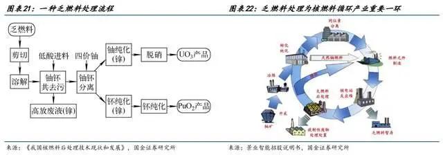 乏燃料指依旧含有大量放射性元素,但铀含量不足以继续维持核反应的核燃料。乏燃料处理为核燃料循环产业重要一环,由于目前的反应堆技术对核燃料中的铀利用率较低,乏燃料中仍有可观的铀和钚可以回收再利用,建立乏燃料后处理闭环,对于铀资源利用率将有明显提升。