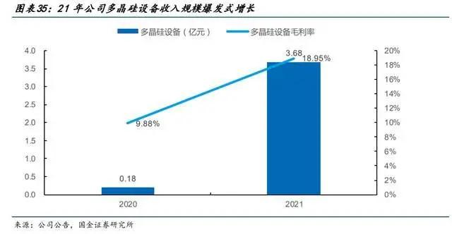 21年公司光伏板块收入开始爆发,多晶硅设备收入3.68亿元,20年仅为0.18亿元,同时毛利率达到18.95%,同比增长9.07pcts。
