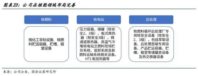 1)核能:公司目前核级资质较为齐全,在核能领域拥有一类放射性物品运输容器制造许可证、民用核安全设备设计许可证(核安全3级)、民用核安全设备制造许可证(核安全2、3级)等多个核领域相关资质,覆盖从上游核化工装备和核燃料贮运容器,中游核电站装备,到下游核乏燃料循环后处理装备的核能装备产业链,产品包括贮运容器、核电压力容器、换热器、乏燃料后处理设备等。取得了中核集团、中广核集团等40余家核电业主单位供应商资格。未来伴随中国核电站、乏燃料后处理厂建设成长前景广阔。