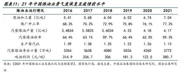 从景气度看,21年中国炼油业景气度恢复至疫情前水平,原油加工量突破7亿吨,炼厂开工率达到77.2%创历史最高水平,炼油效益也创历史新高,21年中国炼油企业实现吨油利润约381元,较20年提高约258元/吨,较19年提高约199元/吨。
