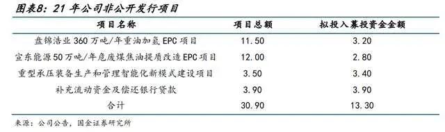 21年公司通过非公开发行募资13.30亿元,用以协同瑞泽石化,提升传统能源高效利用领域EPC工程总包实力,加速公司向服务型制造商转型。