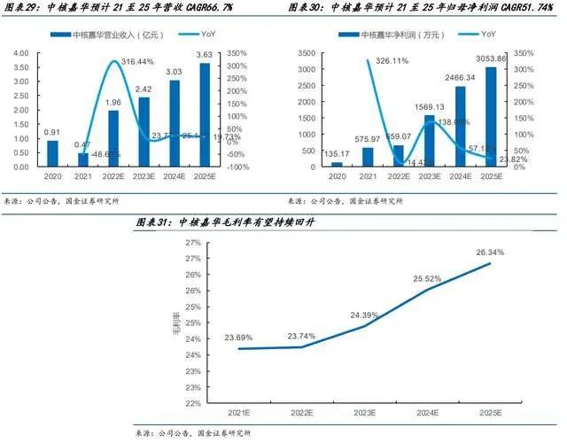2)从公司业绩预测看:中核嘉华预计营业收入2025年达到3.63亿元,21至25年CAGR66.7%;净利润25年达到3053.86万元,21至25年CAGR54.74%;毛利率有望持续提升,25年达到26.34%。