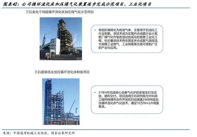 在传统能源制氢领域,公司目前拥有大型煤制气、甲醇制氢、天然气制氢等技术,设计并研制完成了国内首套低阶粉煤循环流化床加压煤气化示范项目,兰石金化千吨级循环流化床加压煤气化示范项目,核心设备循环流化床加压气化炉逐步走向市场工业化应用。
