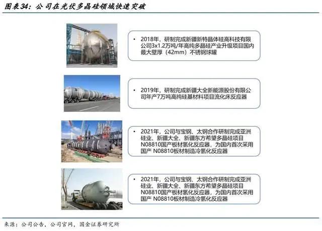 3)光伏:主要布局多晶硅制造所需的五大类核心静设备,包括冷氢化反应器、还原炉、换热器、塔器、球罐。目前覆盖了亚洲硅业、东方希望、大全能源、合盛硅业、宝丰能源、协鑫能源、新特能源等头部企业。