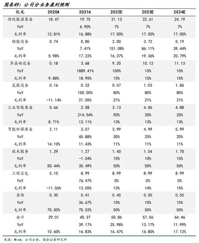 工程总包:公司依托传统能源装备制造业优势,积极拓展EPC工程总包市场,21年EPC工程总包业务增速76.47%,预计公司EPC总包业务将保持稳健增长,22至24年增速分别为25%/15%/10%。