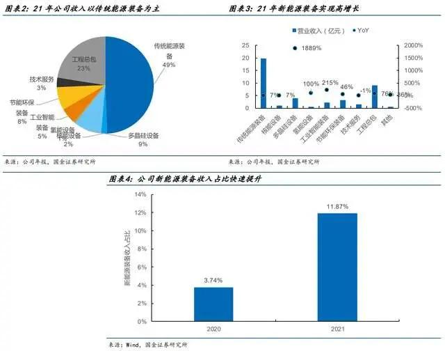 21年公司收入约49%来自于传统能源装备,但新能源装备实现了高增长,光伏多晶硅设备订单爆发式增长,取得东方希望、亚洲硅业、大全能源等客户多晶硅设备订单6.91亿元,同比增长277.60%,取得包括光伏多晶硅、核能、氢能等领域换热器在内的各类换热器产品订单4亿元,同比增长25%。