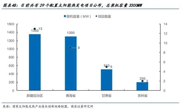根据国家太阳能光热产业技术创新战略联盟统计,在国家相关政策的指导和支持下,目前在各地政府公布的大型风电光伏基地项目、新能源市场化并网以及直流外送等项目名单中(不含企业正在运作或计划建设的项目)配置太阳能热发电项目29个,总装机容量约3300MW。